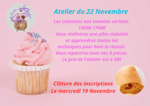 L’atelier sera ciblé sur la pâte à ciabatta. Aucun prérequis n’est nécessaire. Vous serez encadrés par une professionnelle qui vous guidera pas à pas. Vous apprendrez toutes les techniques nécessaires pour que vous puissiez la refaire à volonté chez vous. Vous aurez la satisfaction de repartir avec vos produits finis.