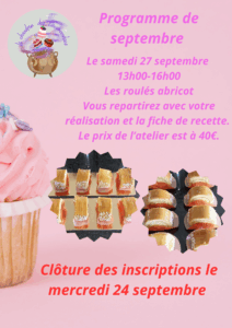 Les roulés abricot sont composés d’une pâte savoie et de marmelade d’abricots. Vous apprendrez toutes les techniques pour bien réussir vos roulés. Vous repartirez avec vos produits et la fiche de recette. Le prix de l’atelier est à 40€