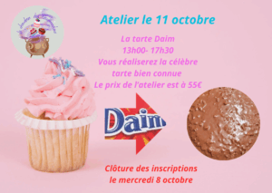 Atelier adultes. La fameuse tarte Daim bien connue. Vous réaliserez une génoise, une crème onctueuse et une ganache. Vous repartirez avec la fierté de pouvoir présenter et faire déguster cette délicieuse tarte tant appréciée par beaucoup d’entre nous.