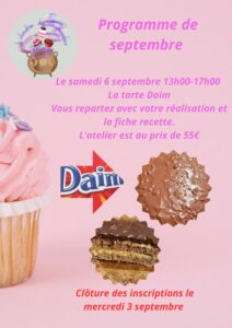 Atelier tarte aux Daim Quand 6 septembre 2025 09:00 - 13:00 Ajouter au Calendrier Télécharger ICS Calendrier Google iCalendar Office 365 Outlook Live Réservations Les réservations sont closes Où Le chaudron des gourmandises (Fosses-la-ville) rue de Walcourt, 122 , Le Roux , 5070 Type d’évènement Ateliers boulangeries Carte non disponible Venez réaliser une tarte original à base de Daim . Vous repartirez avec vos gosettes et la fiche recette. l’atelier est au prix de 55€. Place limitées à 4 personnes Réservations Les réservations sont closes pour cet évènement.